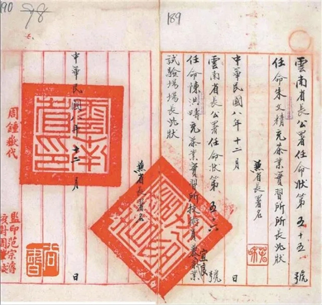 1919年12月,云南省長公署任命朱文精為茶業(yè)實(shí)習(xí)所所長的委任狀