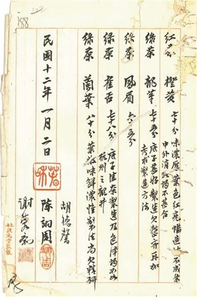 1922年11月,朱文精將實(shí)習(xí)所焙制的5種茶樣交實(shí)業(yè)司,轉(zhuǎn)送上??偵虝诱垖<以u定。擔(dān)任上??偵虝褂[會茶葉審查員的胡德馨、陳翊周、謝蓉齋3位茶業(yè)專家在詳細(xì)查驗(yàn)品評茶樣后,聯(lián)合出具了報(bào)告書。報(bào)告書記載,5份茶樣,合紅茶1份,綠茶4份,分別是橙黃、龍華、鳳眉、雀舌、蘭葉。其中蘭葉“葉嫩味鮮濃”得分最高,獲得80分。總體來看,專家們認(rèn)為茶業(yè)實(shí)習(xí)所送評的茶葉,無論紅茶還是綠茶,茶葉的底子都好,但制法上尚欠精研,還需提高。