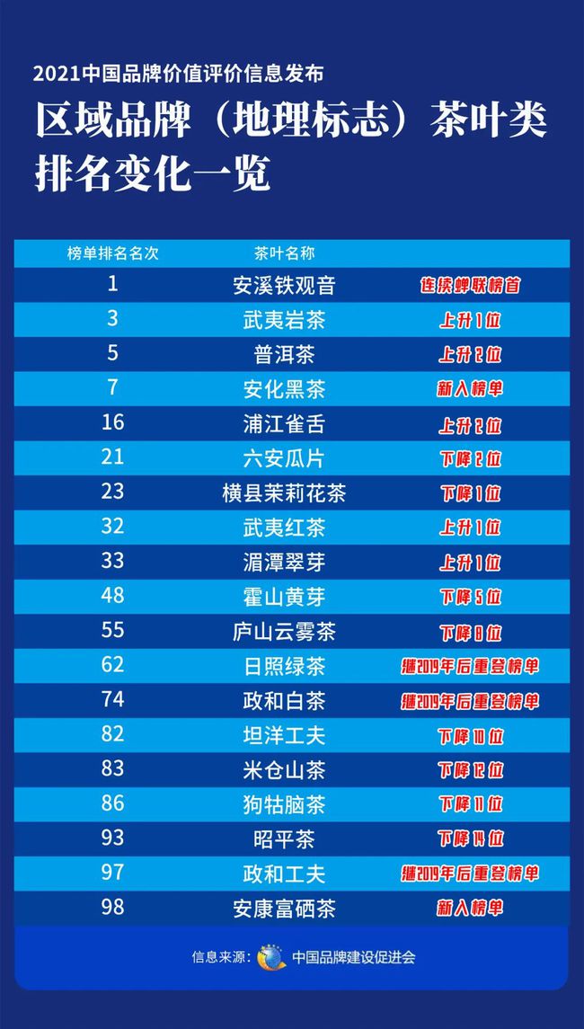 5升8降!2021中國(guó)品牌價(jià)值評(píng)價(jià)信息發(fā)布 區(qū)域品牌(地理標(biāo)志)茶葉類排名變化一覽