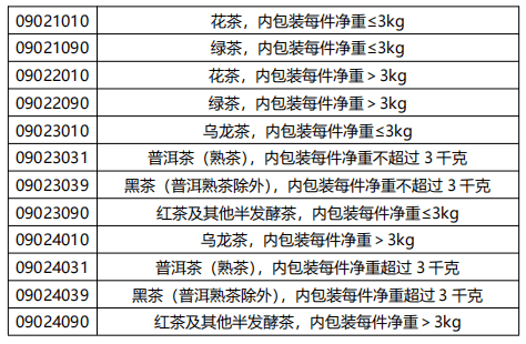 2020年12月,國(guó)務(wù)院關(guān)稅稅則委員會(huì)對(duì)茶葉類進(jìn)出口稅號(hào)進(jìn)行了調(diào)整,新增黑茶出口稅號(hào)類目,調(diào)整后茶葉進(jìn)出口商品編碼及商品名稱信息如下: