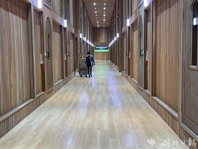 走進(jìn)“洞茶木倉”,只見內(nèi)部空間被分割成一間間木屋。透過木門上的玻璃,可見木屋內(nèi)堆碼整齊的一箱箱青磚茶成品。木屋內(nèi),保持適宜青磚茶存儲(chǔ)的恒溫恒濕環(huán)境。一個(gè)木屋就是一個(gè)倉,“洞茶木倉”一共48個(gè)倉,每個(gè)倉可存放20噸青磚茶。